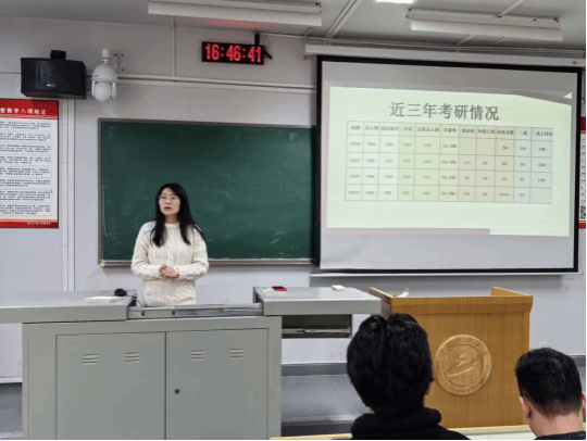马老师从复试调剂全流程、复试具体流程介绍、复试备考攻略、调剂攻略四个方面向学生们进行详细的讲解。两位毕业生代表聂航宇、袁嘉净同学从考研复试的基本流程、考核方式、考核内容、如何备考等方面,对整个的复试过程进行了详细说明,分享了自己总结的心得体会和注意事项等细节,并于学弟学妹们积极互动,提供了很多有价值的建议。