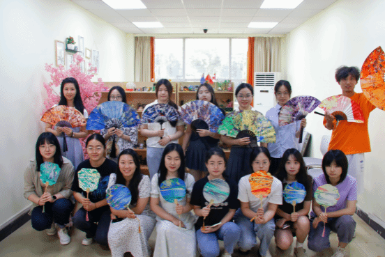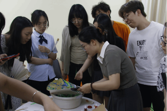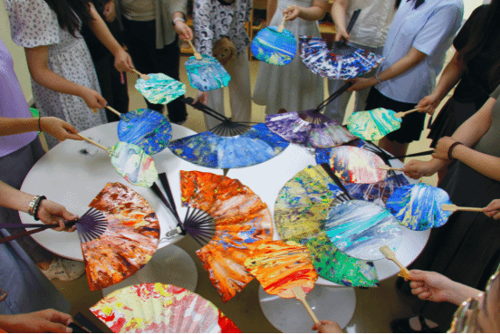 毕业生与老师们一起充分发挥创造力,各自选择颜料滴入水中,再将扇子浸入水中实现上色,像开盲盒一般,每个人都制作出独一无二的具有艺术感的漆扇。制作完成后,同学们把承载着满满诚意与祝愿的扇子送给老师,以制作中国非遗文化漆扇为载体,借助漆扇的独特魅力,将祝福与期望寄托于扇面之上,传递于温情之中。即将告别校园的大四学子们以一种别样的方式表达感恩之情,为老师们献上最真挚的祝福。