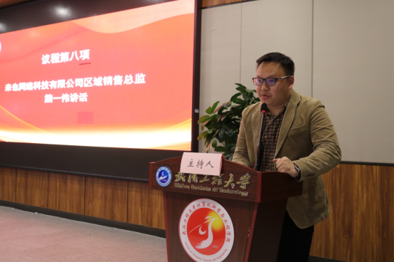 张炜代表学院致欢迎辞。张炜对湖北思高科技发展有限公司和北京来也网络科技有限公司给予我院的关心和支持表示感谢,同时表示我院将努力实现把企业支持做成帮助学子成长成才的事实工程;成为各界人士奉献社会、弘扬新风的爱心工程;成为青年学生切身感受社会关爱、立志成才、报效祖国的教育工程。