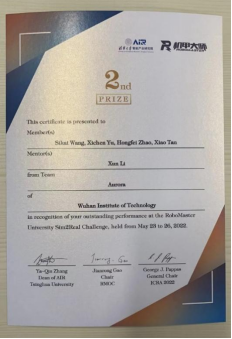 本网讯(通讯员 王司恺 李迅)近日,由清华大学智能产业研究院、大疆和ICRA联合举办的ICRA机器人Sim2Real挑战赛落下帷幕。由古天乐太阳娱乐集团tyc493 古天乐太阳娱乐集团tyc493本科生王司恺、谭啸、研究生余曦晨、机电工程学院本科生赵鸿飞组成的参赛队Aurora在与慕尼黑工业大学、清华大学、南洋理工大学、华中科技大学、国防科技大学等117支参赛队的激烈竞争中脱颖而出,斩获二等奖(湖北高校排名第一)。