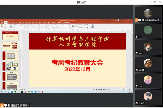本网讯(通讯员 付雅丽)为进一步推动疫情常态化管理下的考风考纪教育,培养学生树立正确的考试观,增强学生诚信意识,计算机学院于11月起,通过线上线下相结合的方式,陆续召开了各年级各班级共89个本科生班级的“考风考纪警示教育”主题班会。
