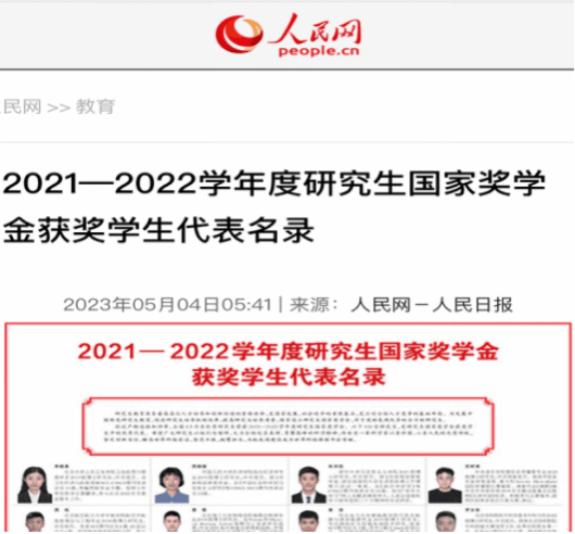 本网讯(通讯员 丁云龙)5月4日青年节之际,人民网正式刊登发布2021-2022学年度研究生国家奖学金代表名录。